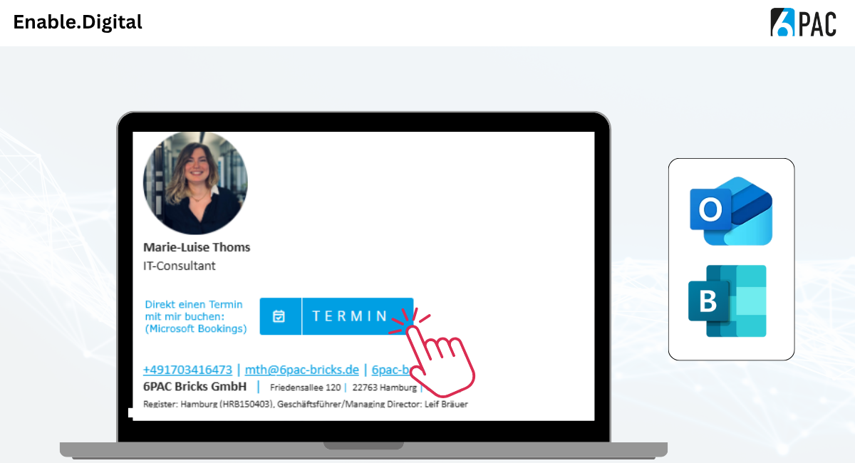 Mit Microsoft Bookings können Sie Terminvereinbarungen direkt in Ihre E-Mail-Signatur integrieren. So wählen Ihre Kunden, Partner oder Kollegen einfach den passenden Slot, ganz ohne ewiges Hin- und Herschreiben.